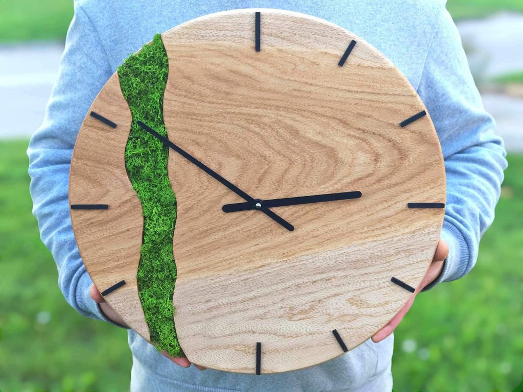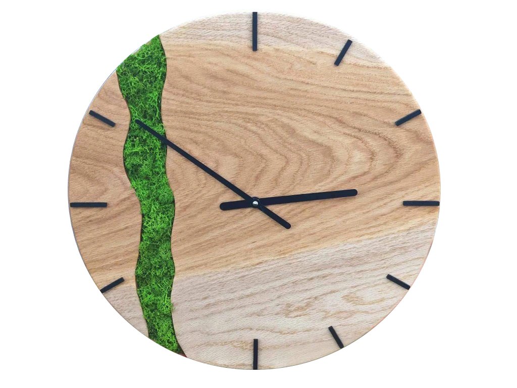 DUBOVÉ HODINY S MECHOVÝM PRUHEM SE BUDOU VYJÍMAT NA STĚNĚ KAŽDÉ MÍSTNOSTI. STABILIZOVANÝ MECH (LIŠEJNÍK) DODÁ HODINAM ZAJÍMAVÝ A MODERNÍ VZHLED.